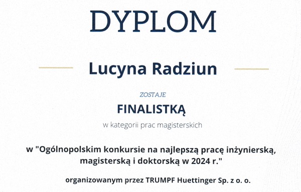 Z przyjemnością informujemy, że w Ogólnopolskim konkursie na najlepszą pracę inżynierską, magisterską i doktorską obronioną w roku 2024, zorganizowanym przez firmę TRUMPF Huettinger Sp. z o.o., wyróżnienie uzyskała Pani mgr inż. Lucyna Radziun, ubiegłoroczna absolwentka naszego Wydziału. Tytuł wyróżnionej pracy magisterskiej to: „Analiza drgań pojazdów szynowych w zależności od prędkości i stanu torowiska”. Praca powstała w Instytucie Automatyki i Robotyki pod kierunkiem dr inż. Adama Konieczki. Więcej szczegółów na stronie: https://www.trumpf.com/pl_PL/landing-pages/pl/ogolnopolski-konkurs-na-najlepsze-prace-dyplomowe/. Pani Lucynie serdecznie gratulujemy i życzymy dalszych sukcesów zawodowych!