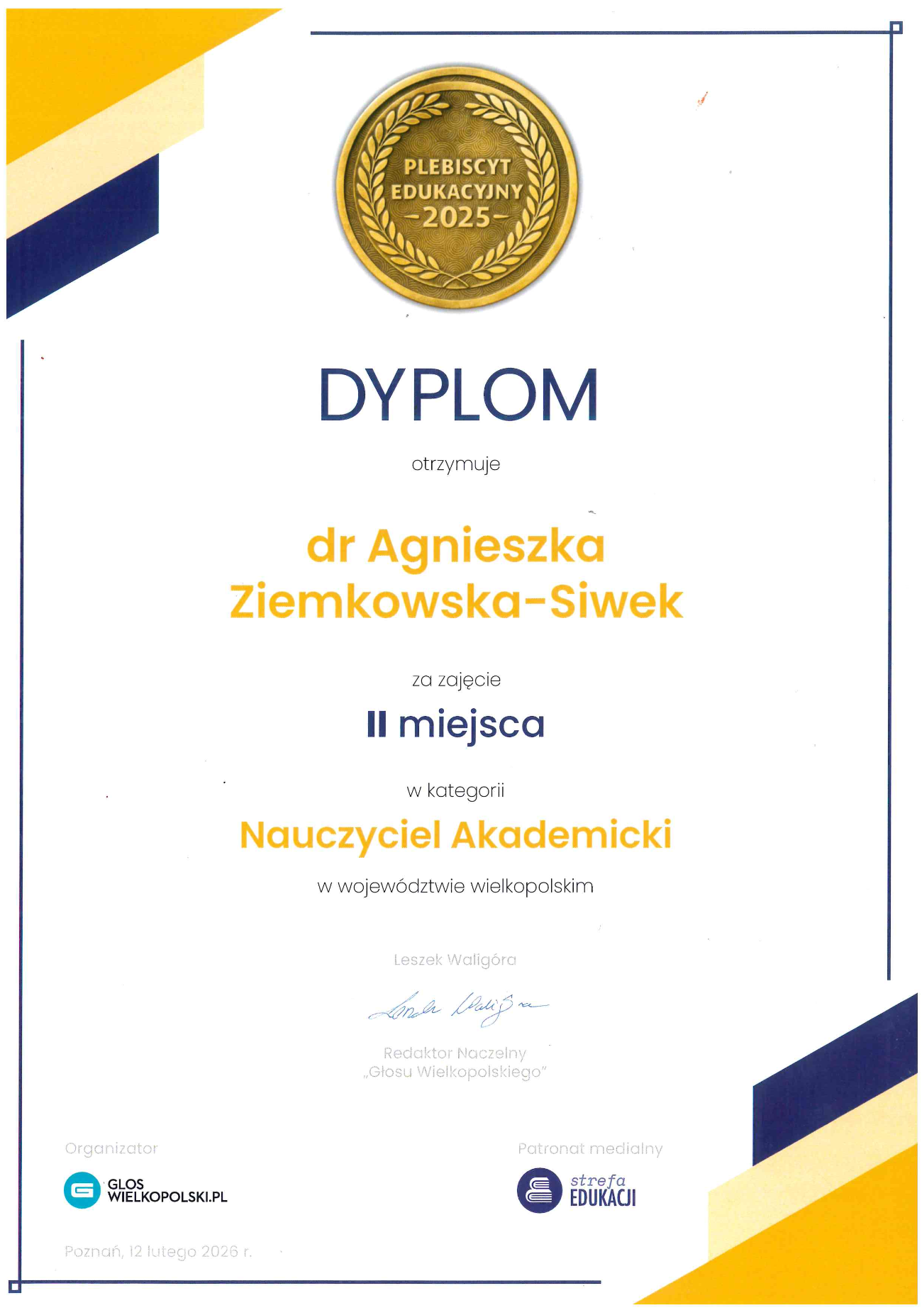 Z przyjemnością przekazujemy, że dr Agnieszka Ziemkowska-Siwek odniosła istotne osiągnięcie w swojej działalności naukowo-dydaktycznej. To wyróżnienie jest wyrazem zaangażowania oraz wysokiego poziomu prowadzonych zajęć.